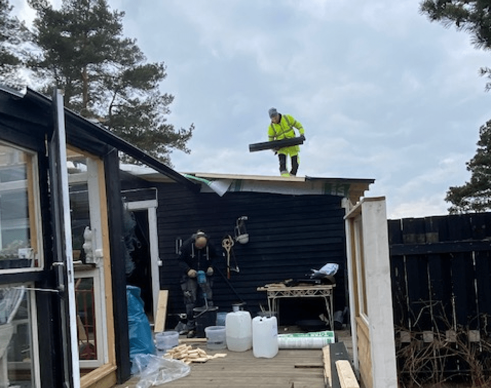 – Det går bra, säger jag och stapplar upp. Ser att Tomek och Krzysztof håller på att rulla ut underpappen på taket. Hann dessutom heja på Tobba (till skillnad från Tobbe som är elektriker) och Anders som lägger andra skiktet av flytspackel på golvet i badrummet.