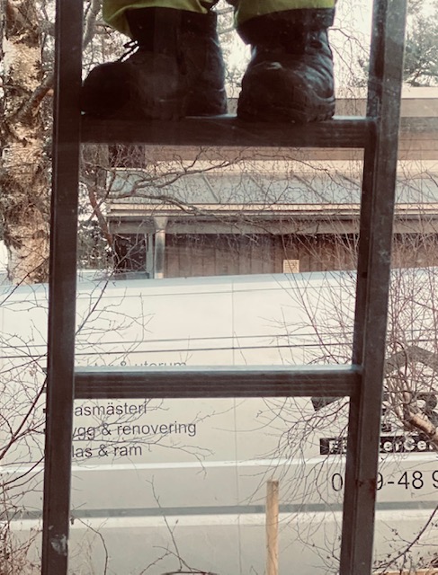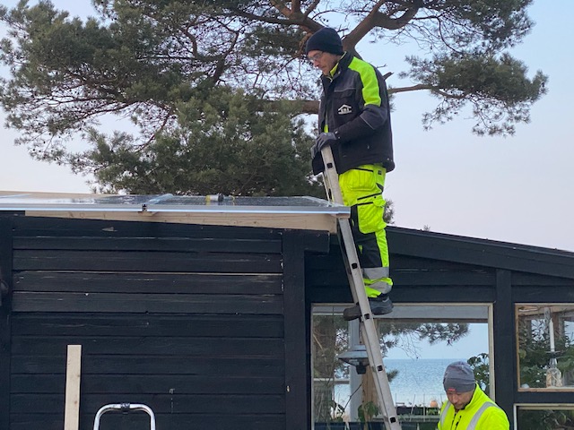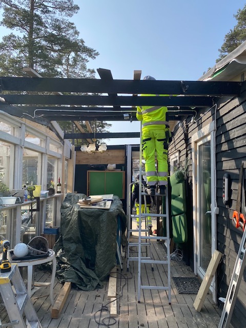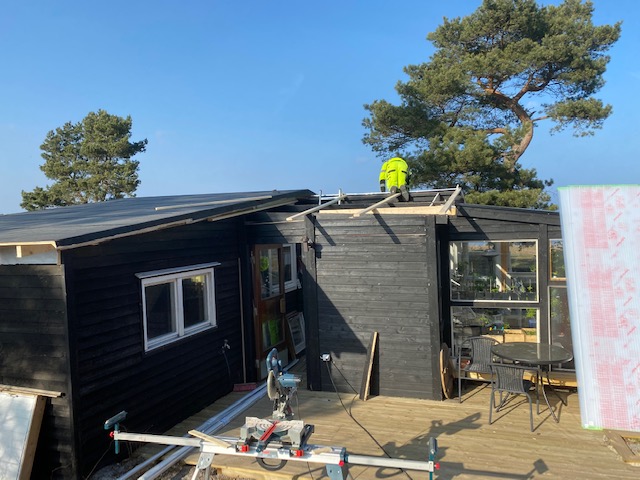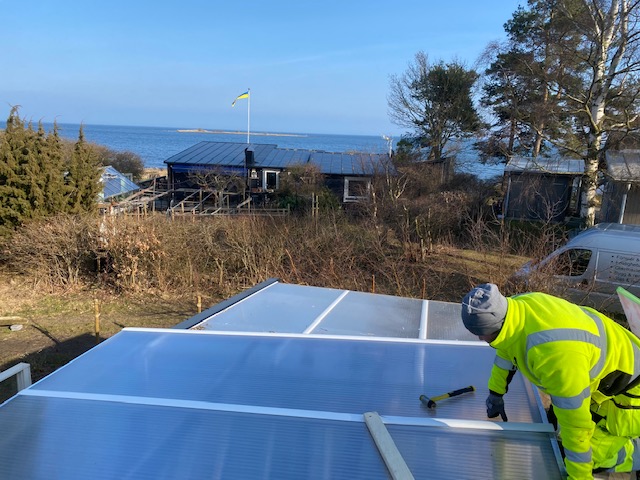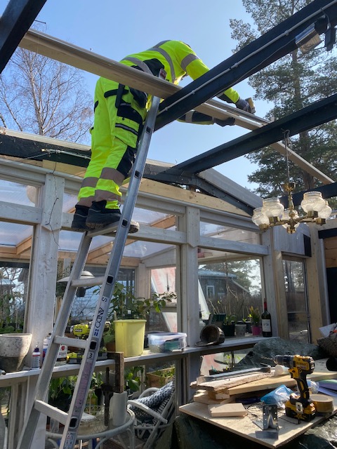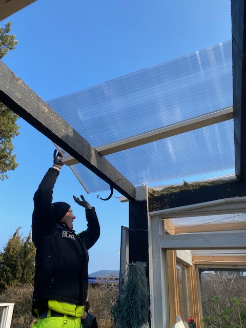 Hon: taket som enligt mitt förslag nu ska bli genomskinligt är det som förut var i trasig och ranglig korrugerad plåt. Resten av taket var i gammal tjärpapp. Som läcker in. Alltså ska vi lägga nytt tak i slät plåt över hela taket. Samma som på hus 1. Men eftersom den den delen med korrugerad plåt har fönster in till köket på ena sidan och växthuset på andra tyckte jag att det skulle bli ljusare med genomskinligt tak där. Och det blir det, men kanske inte så mycket rakare och snyggare än det gamla… dessvärre! (Men det beror alltså inte på ”takläggarna” utan på att huset inte är byggt som hus ska vara byggda, typ. Mer av lapptäcksteknik 🙂