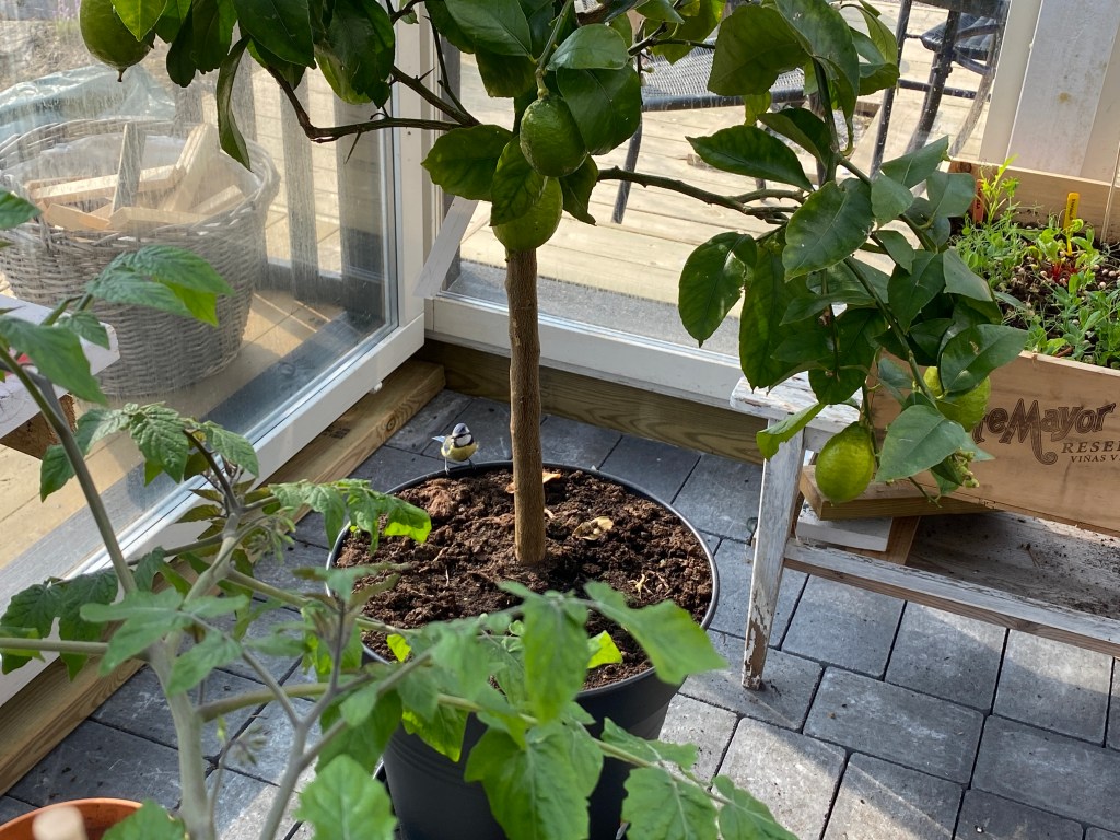 Men först, innan vi kunde ge oss av var jag tvungen att vattna alla plantor inne, och sedan kolla till de som flyttat ut i Växthus 2. Och därinne fann jag en liten rädd gäst, en liten blåmes, som inte hittade till utgången. Fick som tur var snabbt tag i den och släppte ut den igen. Flög glatt iväg!