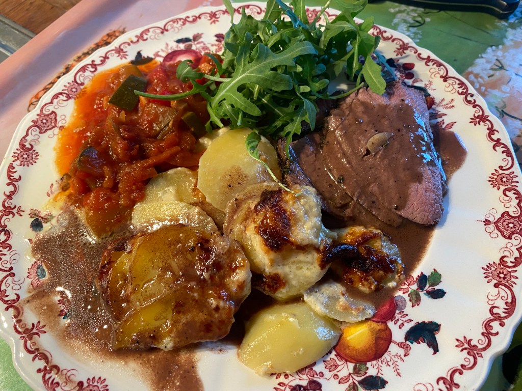 Sen förberedde vi kvällens middag, tillsammans!!! Det brukar inte funka, blir tjafsigt och trångt med utrymmet. Men idag gick det smidigt. Han gjorde potatisgratäng och putsade lammsteken, ja jag gav upp. För mycket senor. Men jag preppade den med vitlök, rosmarin och timjan. Brynte den i stekpannan. Och förberedde en ratatouille.