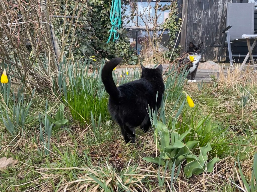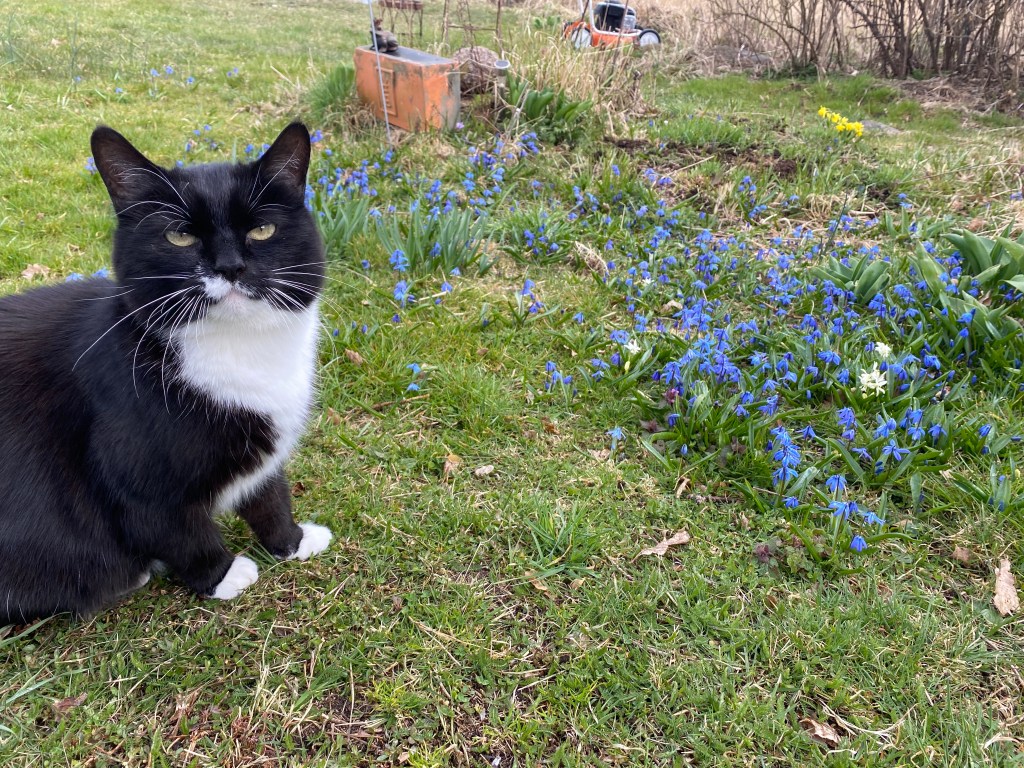 Men den självplanterade Skillan har kommit upp, och vår alldeles egen ”Ferdinand” tycker precis som matte att de är väldigt fina. Skulle förstås gärna se att de var fler och spred ut sig mer som de gör längre inåt viken. Hos oss blommar de dessutom lite senare, antar det beror på att de utsätts för hårdare väder här. Men när de väl kommer igång går det fort. Och påskliljorna som bara bladen syntes på för någon vecka sedan är faktiskt på väg att slå ut. Upptäckte jag och kissarna först idag. Kul! Men var är vårvärmen, nu haglar det…