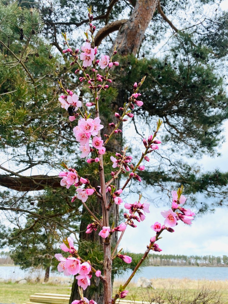 i det vackert blommande mandelträdet, som kanske egentligen skulle vilja kallas valnötsträd.