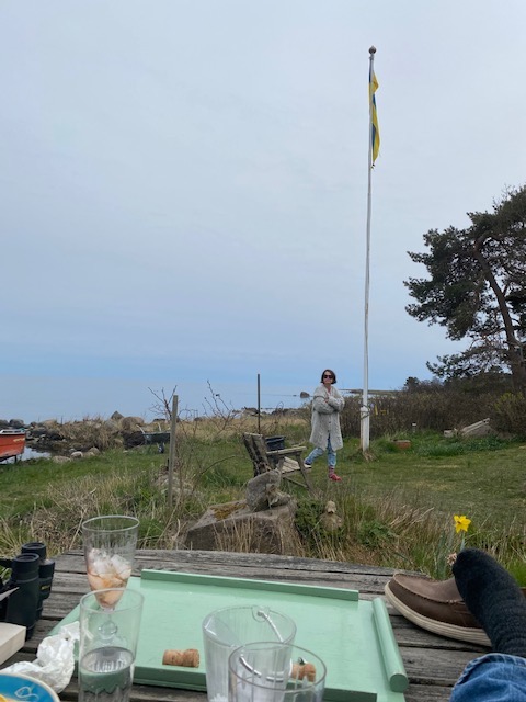 Han: Konstig dag. Alla o-vaneläsare av denna blogg upptäcker genast att det konstigaste med bilden ovan är vimpeln. Den flammar inte stolt i vinden, ty idag har det varit bleke och vindstilla hela dan på udden. Det var inte igår. Även i övrigt har det varit en maklig dag. Har inte tittat en enda gång i Financial Times, Wall Street Journal eller Dagens industri. Har läst Borges, del 3 Om Swedenborg istället, intressant gubbe.