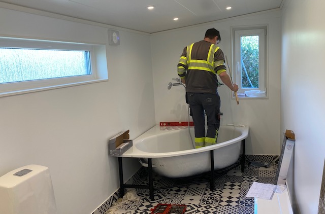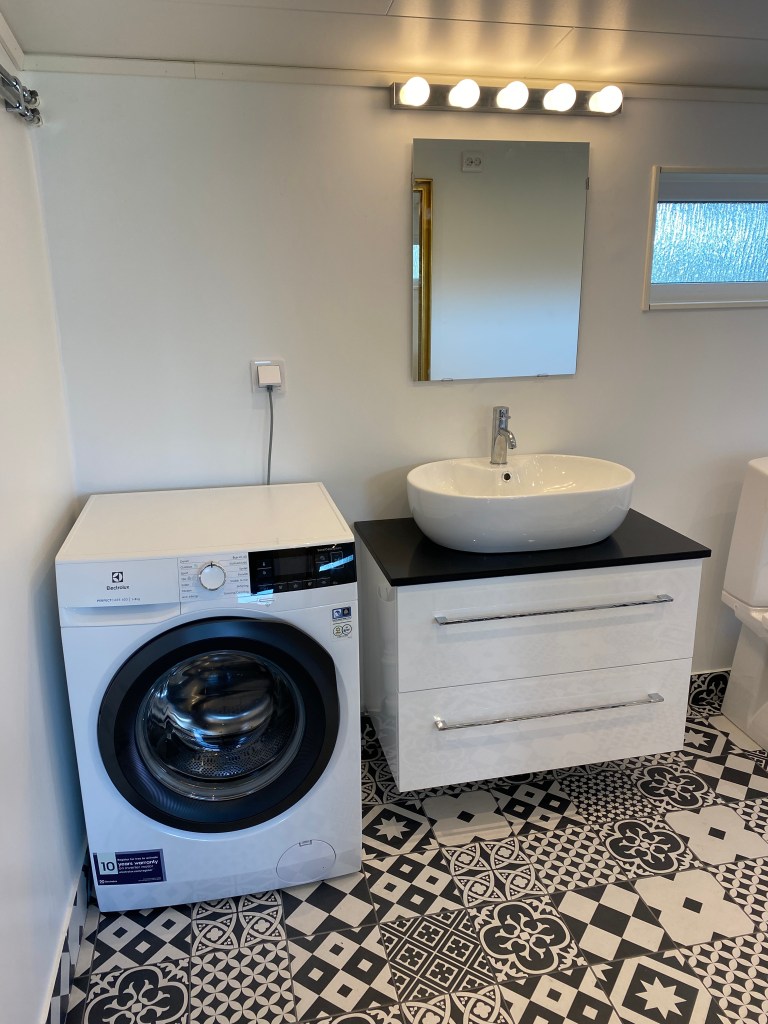 Hon: men i stort sett klart! Hurra!! Det går att bada, vattnet är påsatt, och duscha med utsikt kan man också.