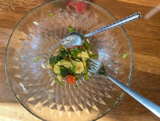 DAGENS MIDDAG: Rester på gårdagens saltrulle fick bli vårens första sallad, inklusive kall potatis, tomater, hennes vitlök, Little Gem-sallad, vintersallad, gurka från Ola i Bröms, ärtor, chili och årets mest underskattade primör: