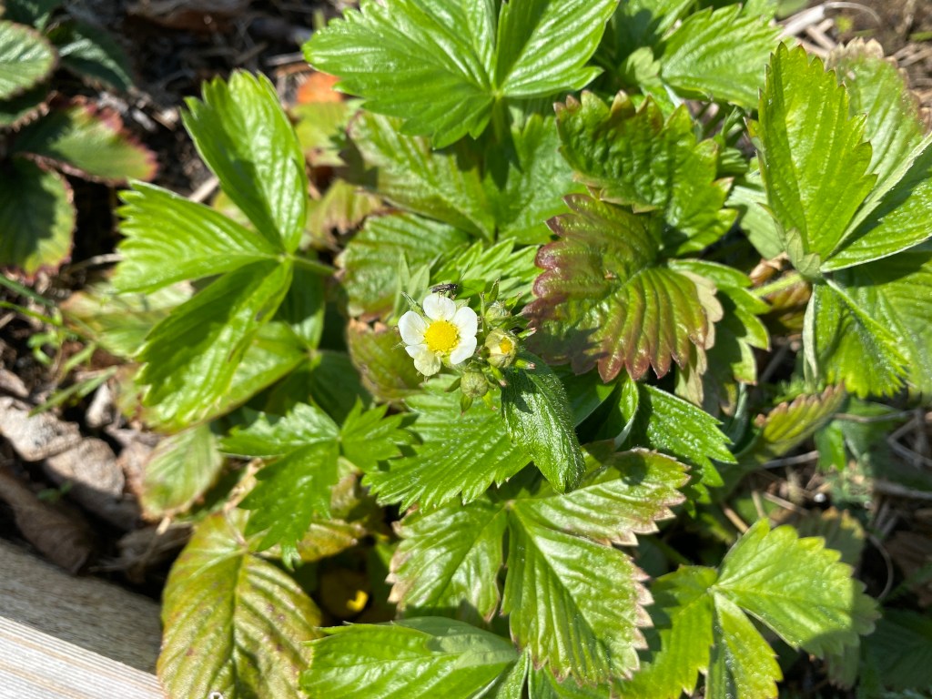Dagens premiär 2: en blomma på jordgubbsplantorna jag sådde från frön inköpta i Paris förra våren. Kan det vara så att vi har franska jordgubbar till midsommar!