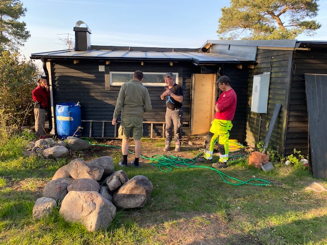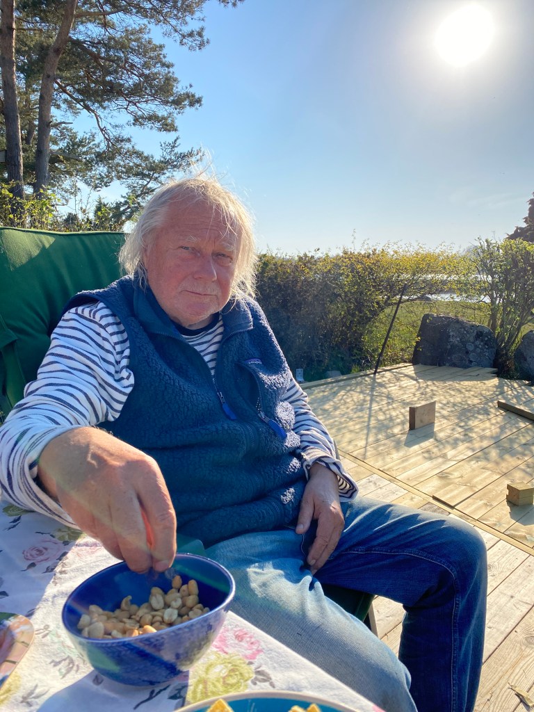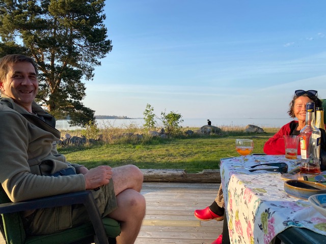 Han: Bästa sättet att få en trevlig kväll är att skapa ett problem. Visst, varmvattenberedaren funkar inte. Men om man väljer rätt hantverkare betyder det att jouren rycker ut även om klockan är 18:30 och det är Flygerhelg. Snart stod både Tobbe elektrikern och Engman och Krzysztof här på udden. Snart var både diagnosen klar och problemet löst och sedan blev det en trevlig stund på verandan. Alla hade vi en trevlig stund även om bara Engman och värdinnan fastnade på bild.