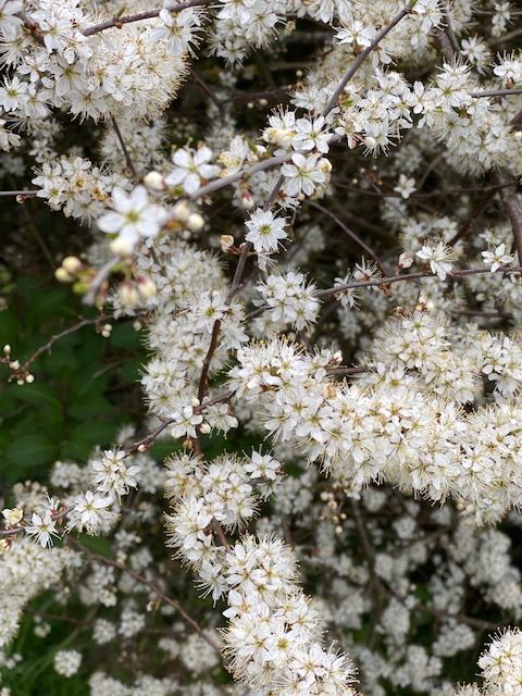 Denna vecka har även slånbärssnåren börjat slå ut. Somliga saker finns bara för att de är vackra och man blir glad bara med ser hur dessa kaskader av gräddvita blommor lägger sig över de buskar som igår var tråkigt bruna och nakna. Slån tillhör rosväxterna men har en egenhet: Den blommar på bar kvist i maj och först efter blomningen kommer de 2-4 cm långa, äggformade bladen med naggade kanter. Buskarna bildar ogenomträngliga snår, där alla våra småfåglar håller till.