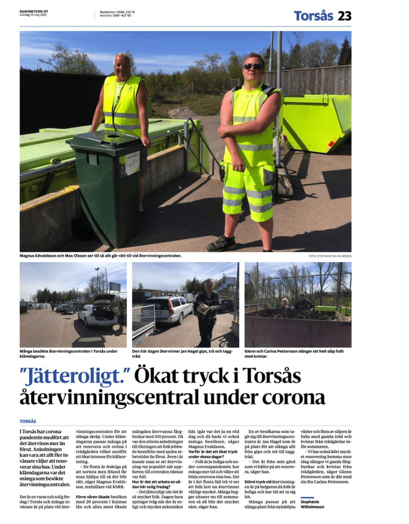 Älskar den känsla för feeling som lokalredaktörer utvecklar varje dag. Men snor en riksnyhet och vinklar om den. Återvinningstationerna har blivit vår nya kyrka i coronatider och runt om i landet ger lokalredaktörer denna riksnyhet färg av Halland, Uppland, Västerbotten, Stockholm.