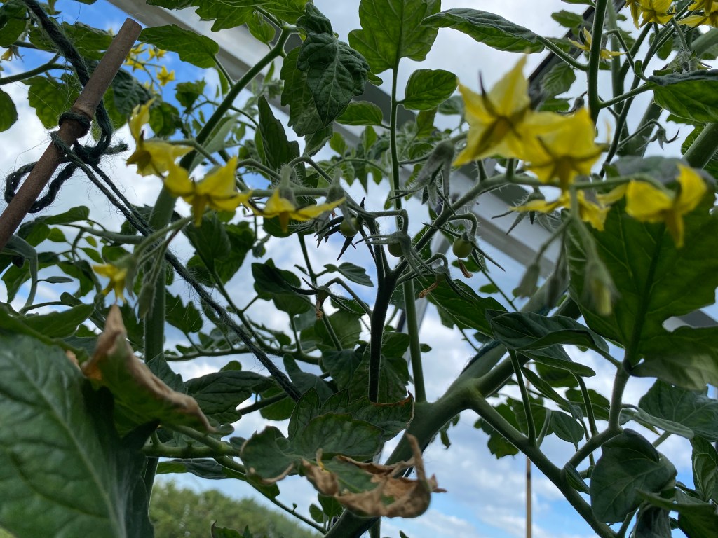 Hon: nu var det dags! Ommöblering i växthus 1. En tomatplanta på hyllan bakom soffan avgjorde det hela, den var uppe i taknocken och höll på att få ”slagsida”. Inte har jag kommit åt att tjuva den ordentligt heller, så den växer hej vilt åt alla håll.