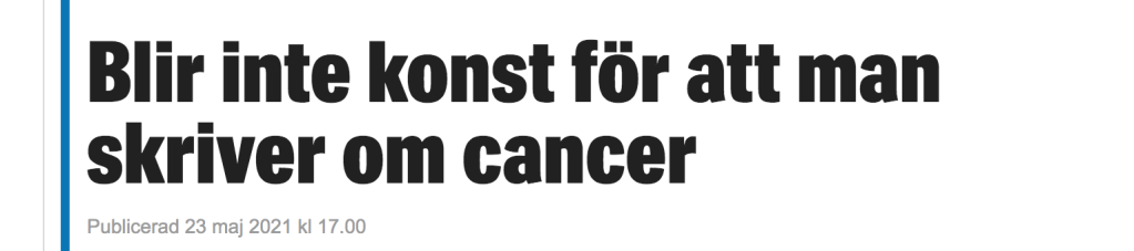 Det är kul när det stormar, åtminstone i en ankdamm och kulturjournalisten Linda Skugge har rätt. ”Det blir inte konst bara för att man skriver om cancer”. Det hävdar Skugge i en recension av hyllade Kristina Sandbergs nya roman ”En ensam plats” (Expressen 23 maj).