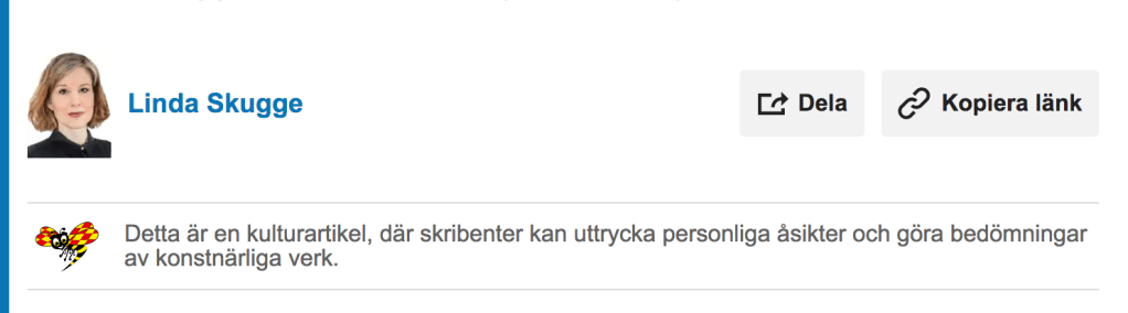 Linda Skugge, som vi P1-lyssnare ofta kan höra prata om sin sjukdom i kulturprogrammet ”Kära Annika” har inte skrivit en recension av Kristina Sandbergs romanen. Hon har skickat in ett typiskt läsarbrev till Expressen där hon är arg över att romanen inte motsvarar hennes krav.