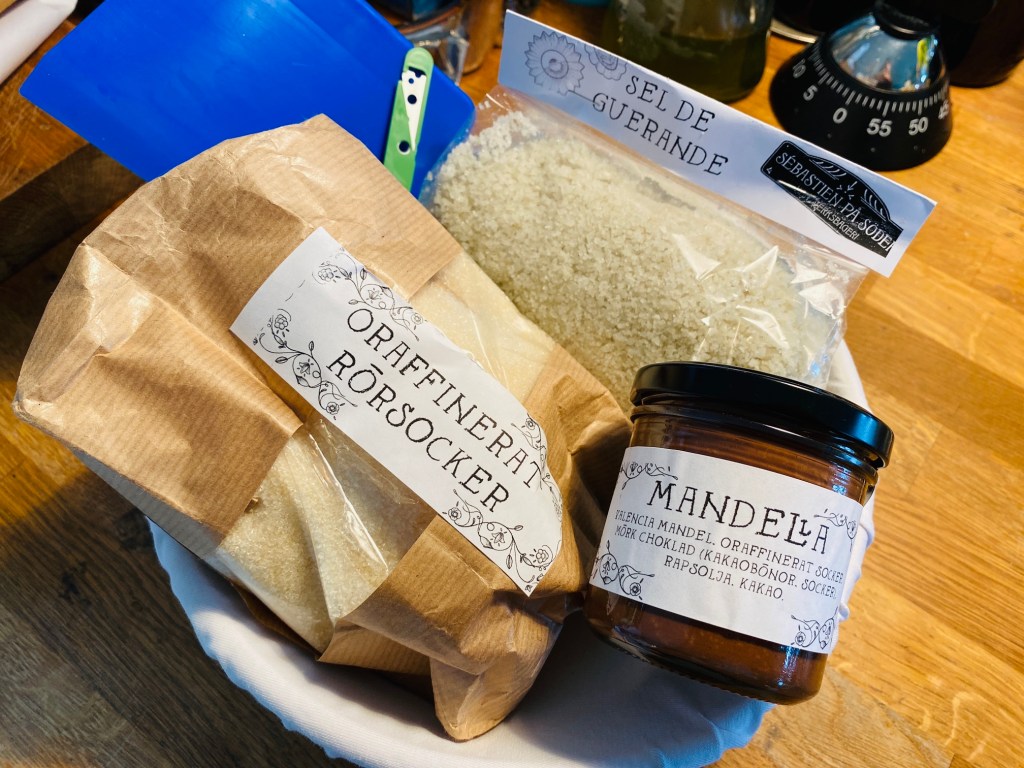 Wow! Socker (oraffinerat naturligtvis), salt (nåt fint proffsigt), degskrapa, rakblad (för mönsterskärning i brödet) och nåt jag inte har en aning om vad det är: Mandella. Blir spännande att smaka.