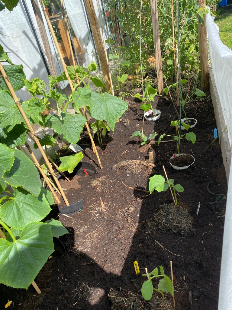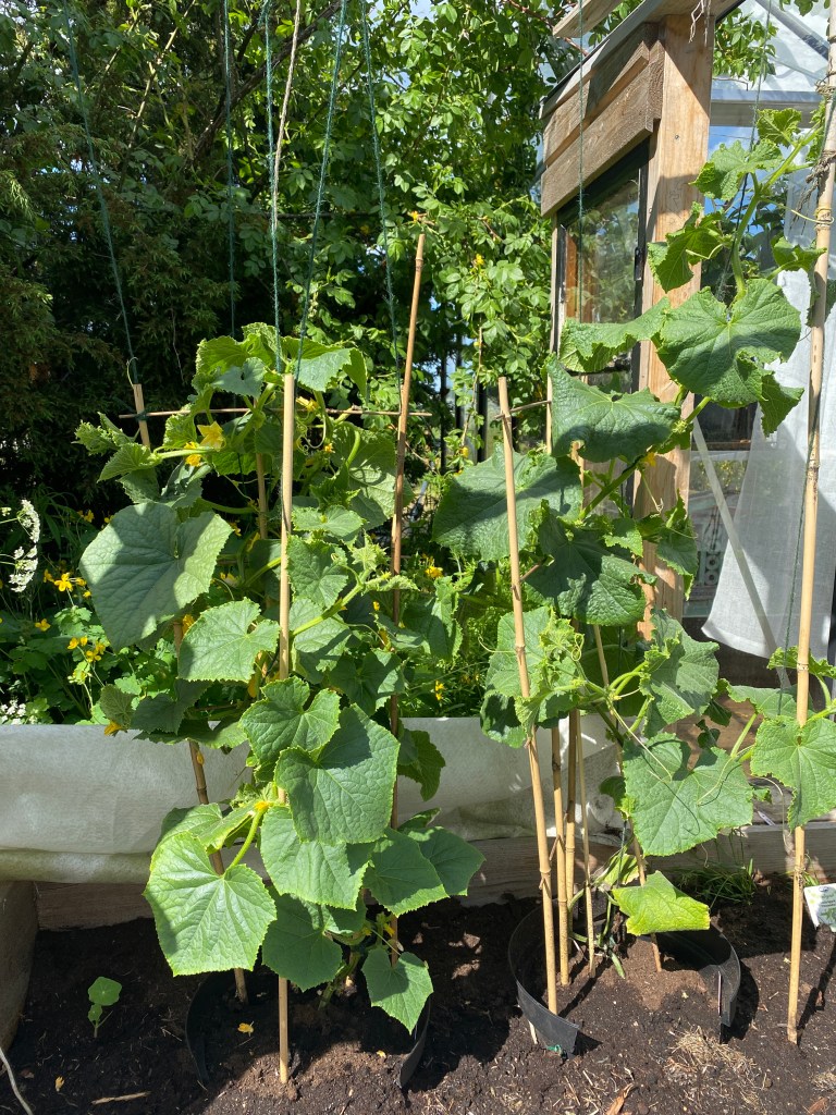 Och så trädgårdsarbetet då… det blev mest gjort i gurklandet. Det börjar ta sig, även de små sent satta är utplanterade. Det såg inte så bra ut i början av säsongen, jag fick helt enkelt börja om. Men de två stora som fick flytta ut i växthuset tidigt, de är gigantiska nu. Och klarade utflyttningen på friland galant också. Nu väntar vi bara på skörden.