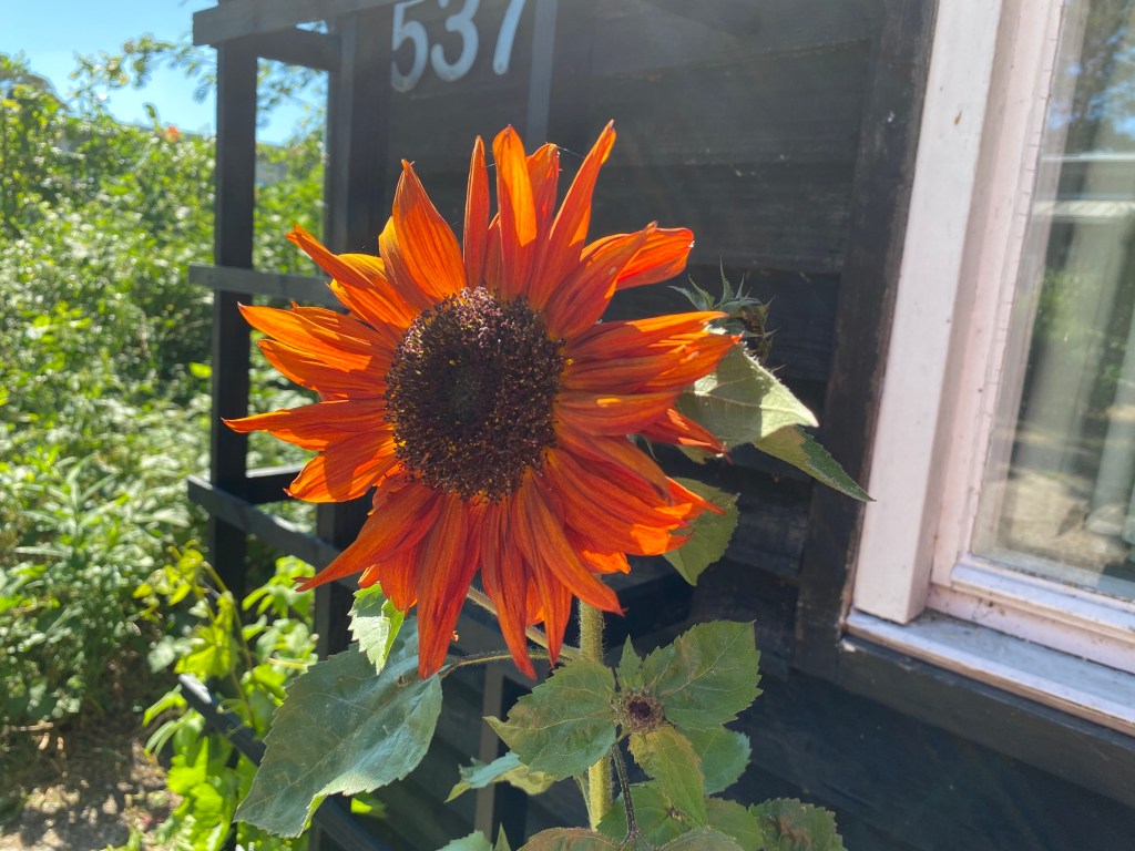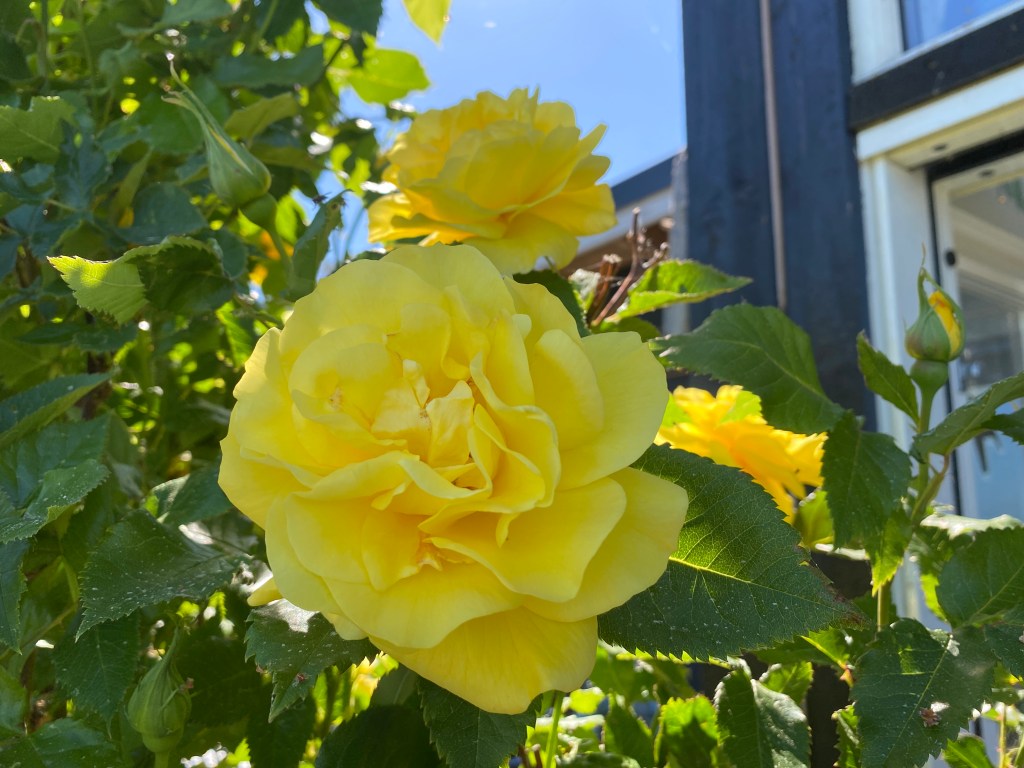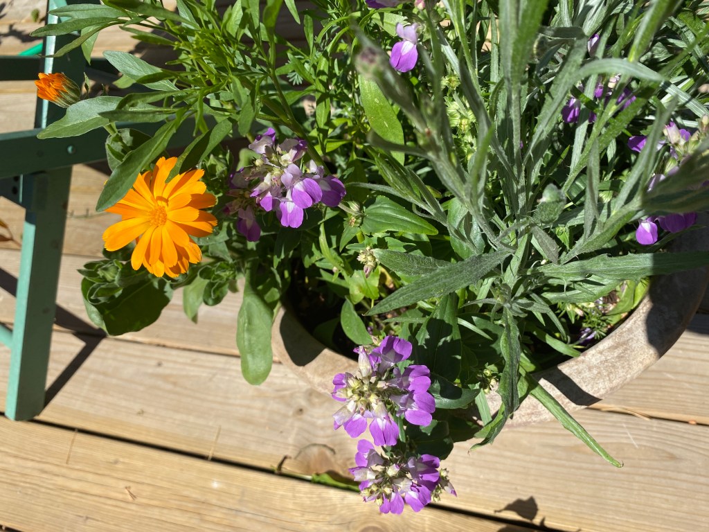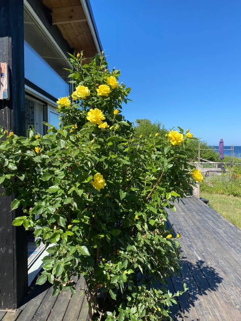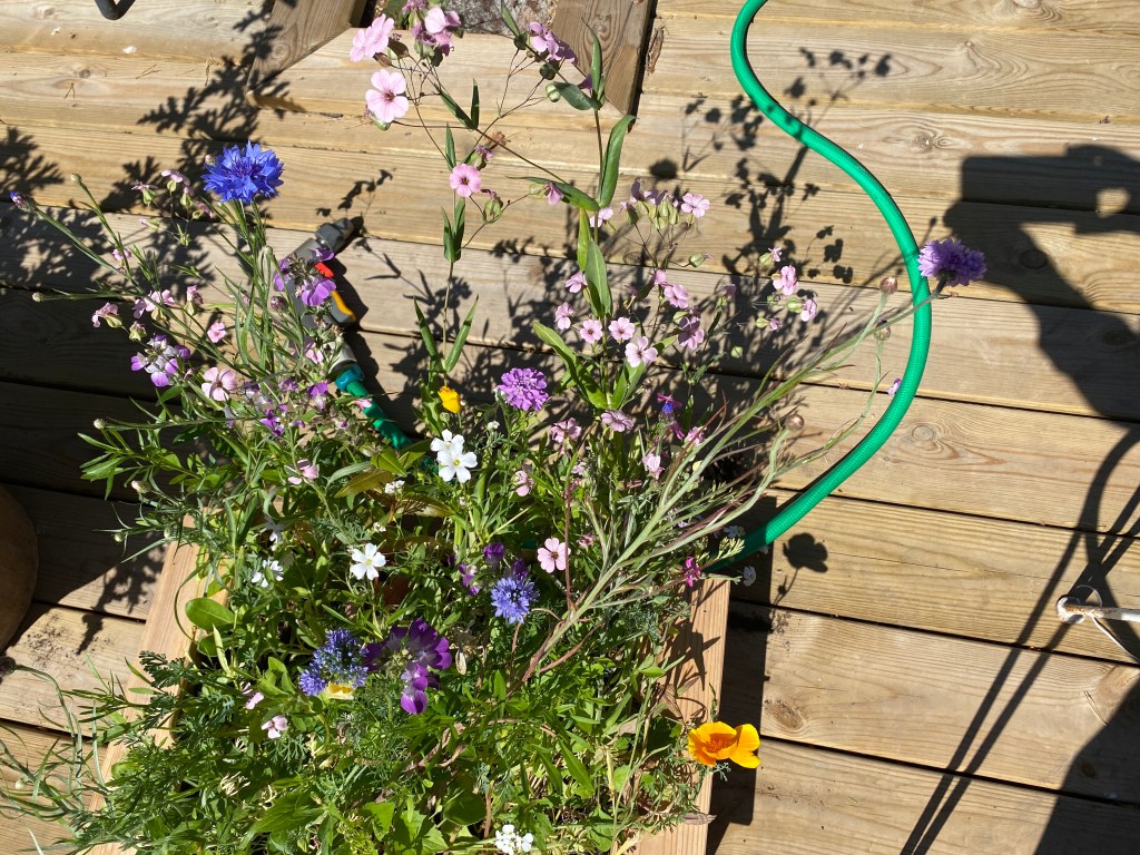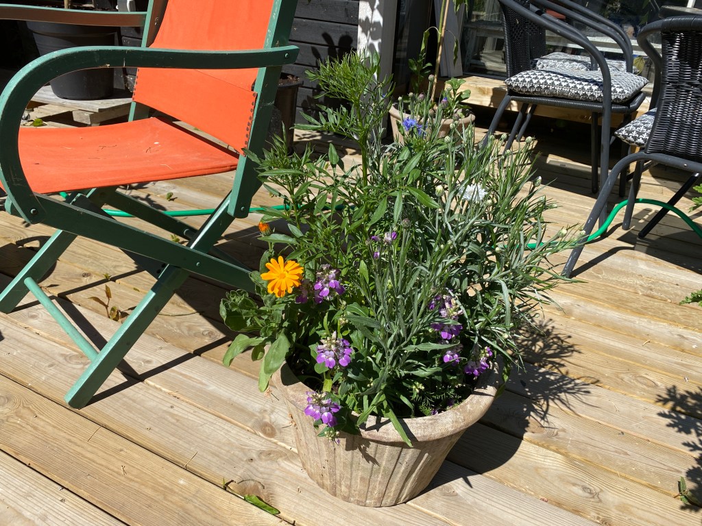 Hon: borde ju ha kört dig in förstås, glömde att du brukar få sådana där droppar som man inte får köra efter. Å andra sidan kan jag knappt se heller eftersom jag är så himla allergisk i ögonen. Fattar inte vad det beror på. Ögonen rinner, det svider och jag blir ljuskänslig. Och trött. Men jag lyckades ta ett par bilder på mina krukor med sommarblommor och vår fina gula ros som börjat blomma.