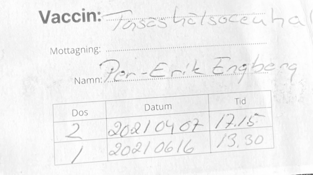 13:20 Torsås vårdcentral. Andra sprutan vaccin, Astrazenica.