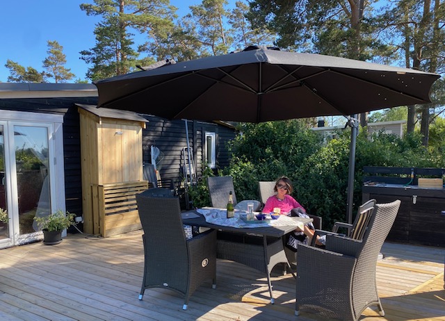08:30 frukost i skuggan under syrenen. Läser morgontidningarna