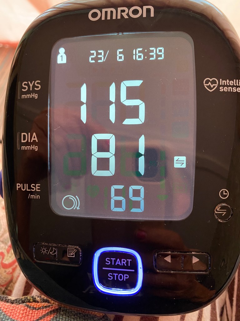 De släpper inte taget om mig på Torsås vårdcentral. Det ska jag ju vara glad för, men tycker de slösar med sin tid på mig och att andra behöver den bättre. Men eftersom jag lider av ”vita–rocket–syndromet” har jag alltid lite för högt blodtryck när jag är där. Alltså har min läkare bestämt att jag måste ta ett morgontryck och ett eftermiddagstryck i en vecka hemma. Jag har fått låna en apparat. Detta var första dagen. Tror inte det är för högt, i alla fall inte idag…