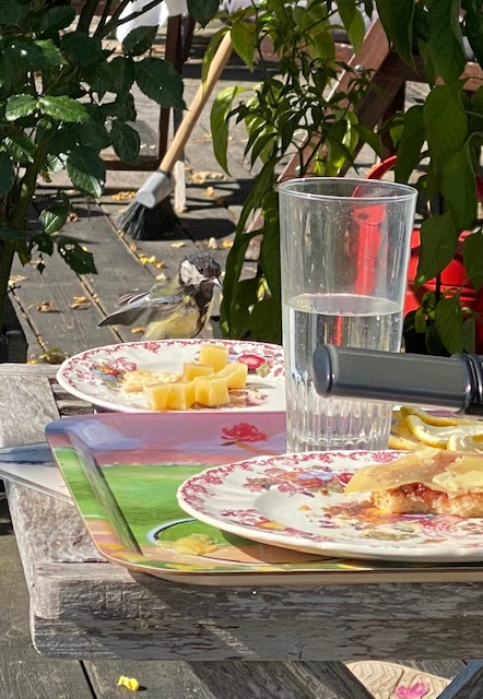 Hon: Och så fick vi sällskap även till drinken. Fanns ju lite ost kvar från frukost: