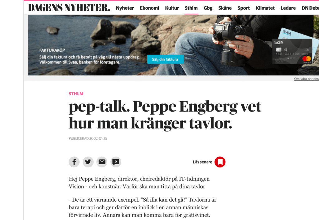 Däremot kan man i efterhand ha synpunkter på hur även jag marknadsfört mina verk – eller värk. I en intervju i Dagens Nyheter läser jag att jag svarat följande på frågor i samband med en vernissage: