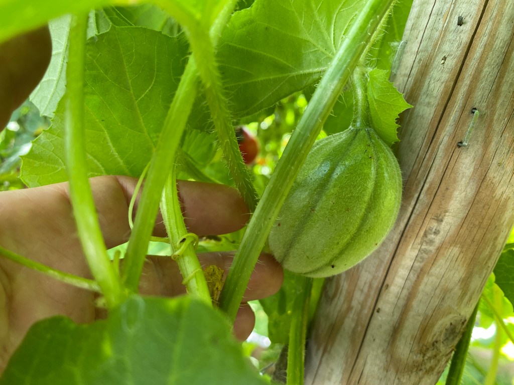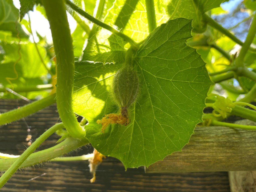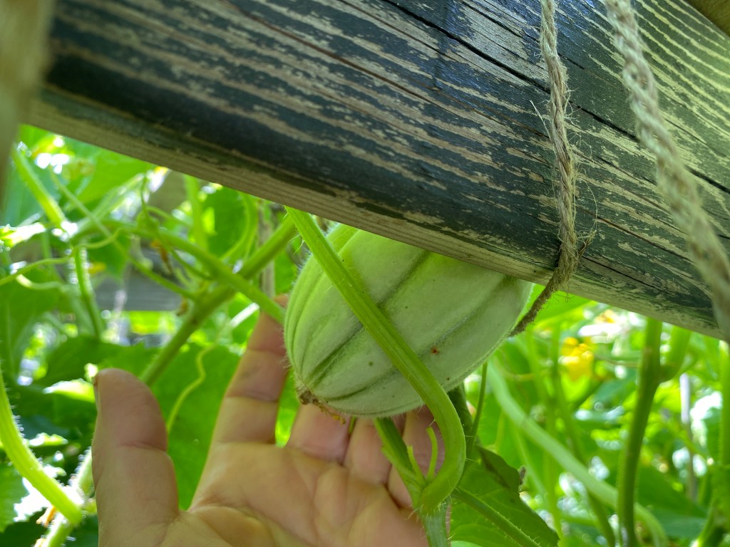 Dagens överraskning: nätmelonerna är på gång, ja på gång på riktigt. Trodde inte det skulle bli några eftersom de förgrenat sig och förgrenat sig och bara bildat nya blommor. Tänkt att jag nog borde tagit mig tid och klippt bort alla sidogrenar i början så lite gett upp hoppet. De står dessutom längst in i gurklandet bakom alla gurkplantorna. Jag har sett ett par små fruktämnen men inte haft så mycket hopp.,.
