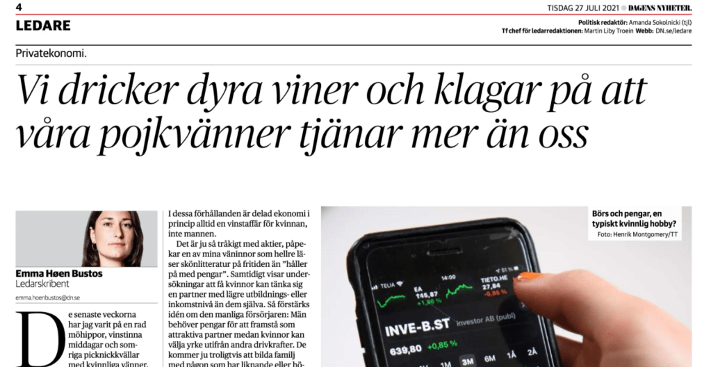 Och Emma Høen Bustos krönika slutar därför med följande förmaning: ”De politiska rättigheter som feminismen har erövrat har varit oumbärliga för kvinnor som kollektiv, men måste också kompletteras med individuella val. Att öppna ett investeringssparkonto, googla ordet ”indexfond” och sätta sig in i sitt sparande är en feministisk handling lika god som någon. För den generation kvinnor vars feminism mest har präglats av slagord på tygpåsar och kroppspositivism på Instagram, kan detta vara värt att påminna om.”