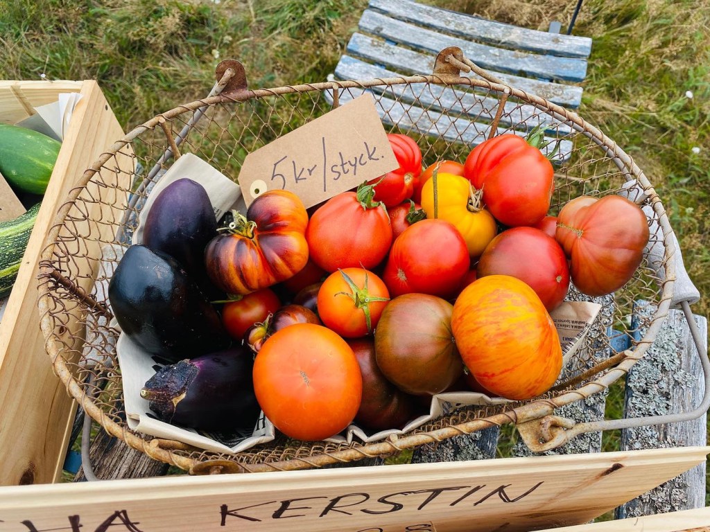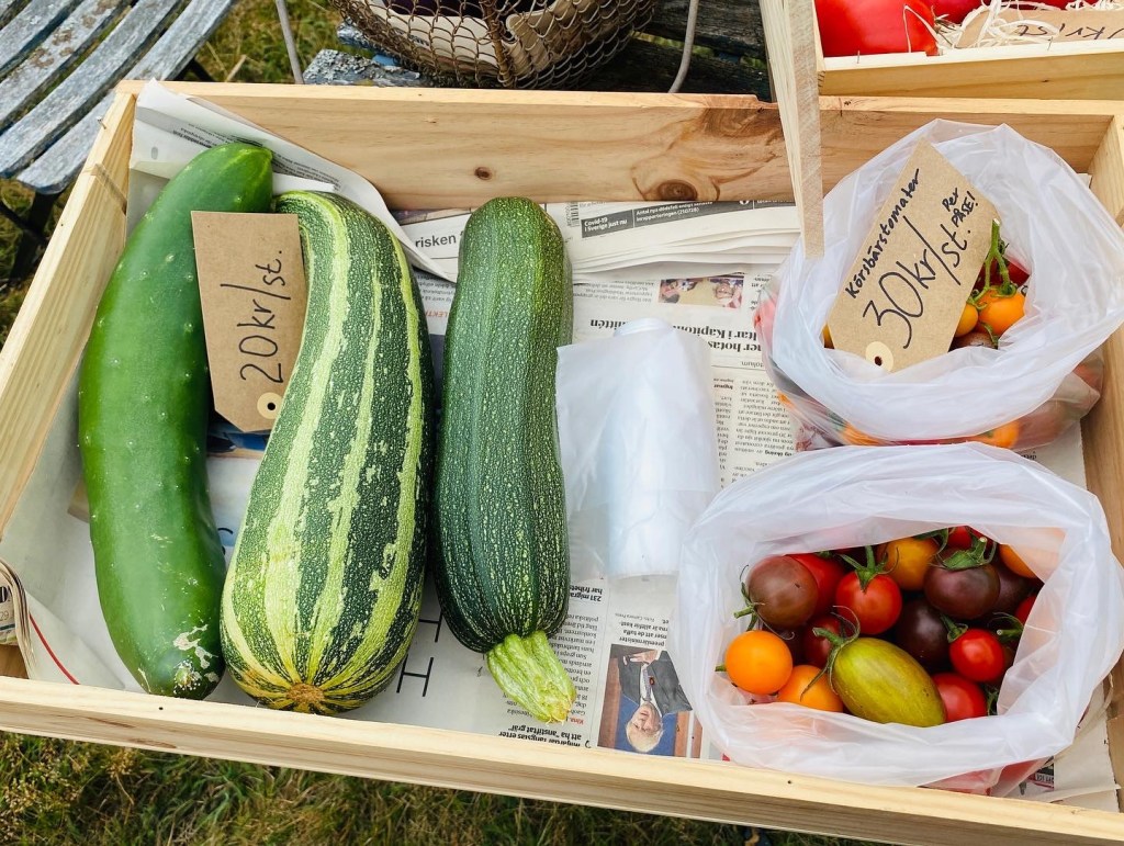 Hon: och jag tycker jag mest gått omkring och känt mig jättestressad över allt jag borde göra, men inte fått något gjort alls av vikt… satte i alla fall ut bordet med lite grejer till försäljning idag också. Och la upp nytt, rensade bort de övermogna (blev ketchup) och fyllde på påsarna med körsbärstomater med några nya sorter. Nu får man ännu mer för pengarna, ha ha. Imorgon åker de i frysen, på onsdag kväll åker jag till Stockholm och ”butiken” stänger över helgen.