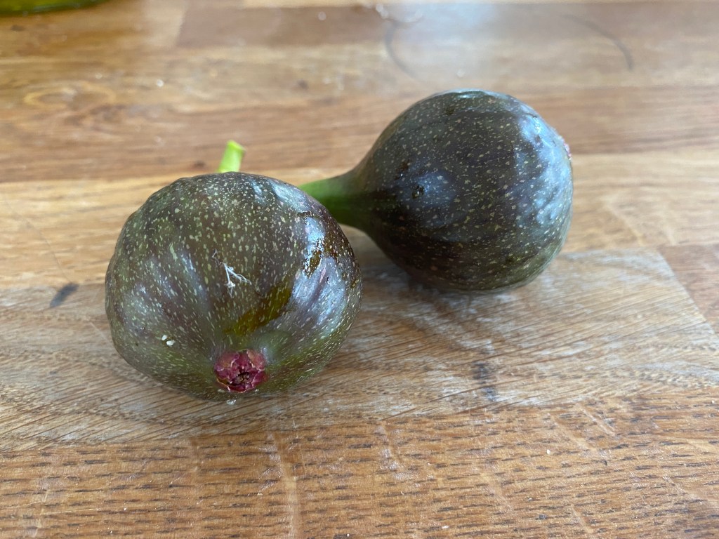 Nu ska vi äta! Först blir det majs, skördade en till idag. En annan sort faktiskt. En halv var från vardera. Spännande avsmakning!!! Till efterrätt blir det fikon från vårt fikonträd, första skörden, också spännande! Huvudrätten inte lika spännande, ha ha, tredje dagen med rester från bolognesen jag gjorde i lördags…