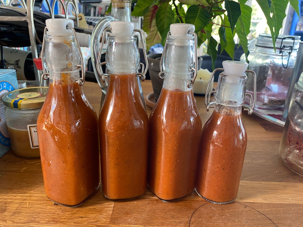 Första Hot ketchup-batchen för i år. Det var bett i den… får nog minska chilin i nästa! Alltså inte jättestark, men tror den starkare än förra årets. Men det här var första, gjord på jäkligt goda tomater. Mest Brandywine och Alice’s dream.