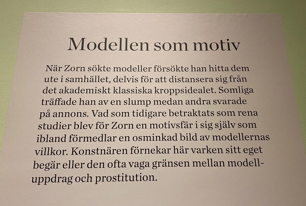 Hon: återkommer till dagen men måste göra ett inlägg till om Zorn. Jag tyckte utställning var ovanligt intressant eftersom den åtföljdes av beskrivningar om samtiden och hur det visade sig i måleriet. Och hur jag då till exempel blev väldigt illa berörd och led med modellen på speciellt en målning: