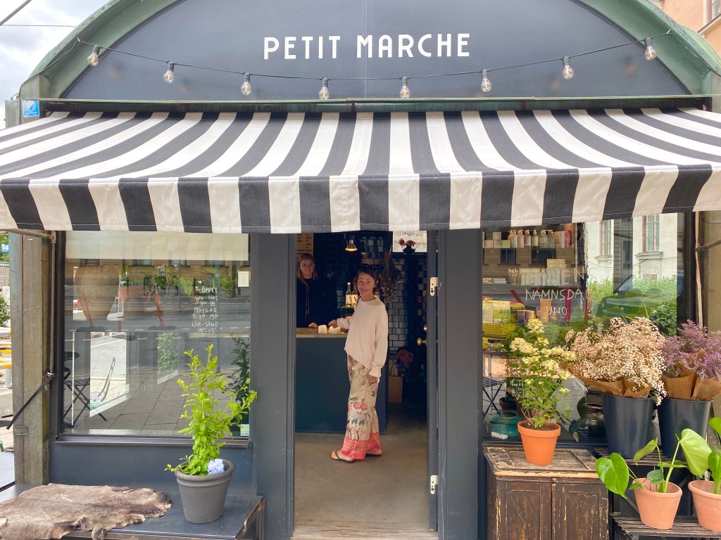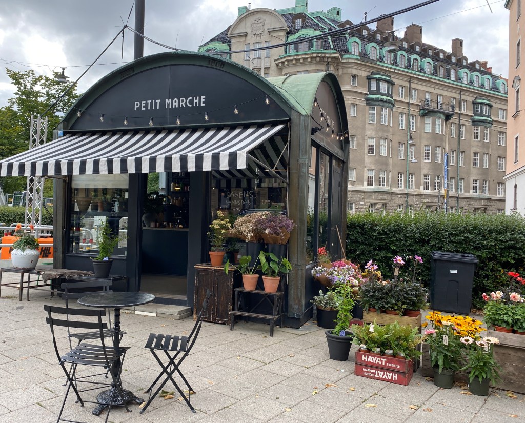 Stopp 1: Petit Marche. ”Mormor” Netas fina blomster-café! Som om man vore i Paris. Var tvungen visa det för Peppe också. Neta är alltså mitt barnbarn Iggys mormor.