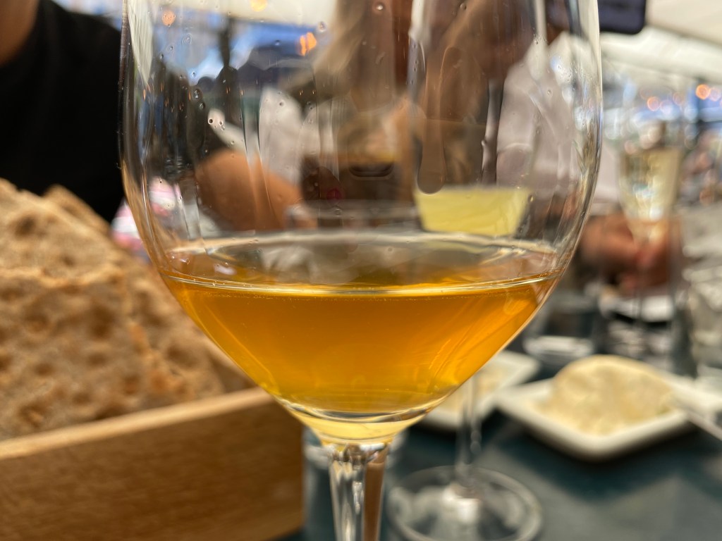 Stopp 3: Lunch på Sturehof (efter 10.000 steg). Tar det lite lugnt med alkoholen ett tag till, men beställde 5 cl av ett Orange-vin eftersom min dotter hyllat det till skyarna. ”Men mamma, det passar ju bättre till ost…” sa hon när jag skickade en bild: