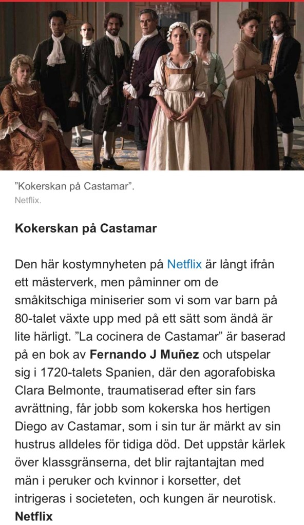 PS: Netflixserien om kokerskan på Castamar var en lisa för själen för oss romantiker på udden. Det enda som är sant (vid sidan kastratsångaren Carlo Broschi Farinelli som dök upp i vårt sovrum vid halvtretiden vid halvtretiden) är möjligen beskrivningen av Filip V och förfallet av det spanska riket som utgör fond till det hjärtknipande kärleksdramat på Castamar.