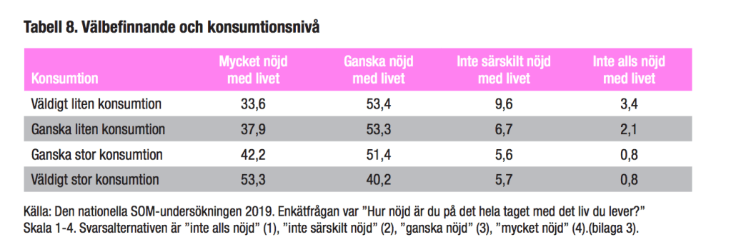 ”Pengar som spenderas på konsumtion har ett samband med konsumenters subjektiva välbefinnande”, konstaterar Konsumtionsrapporten 2020. Ju mer pengar en konsument spenderar desto nöjdare tycks hen vara, skriver forskarna bakom rapporten. ”Sambandet mellan konsumtion och välbefinnande kvarstår även då hänsyn tas till andra variabler som visat sig förklara nöjdheten med livet, exempelvis sambo/gift, sociala aktiviteter och fysiska aktiviteter”.