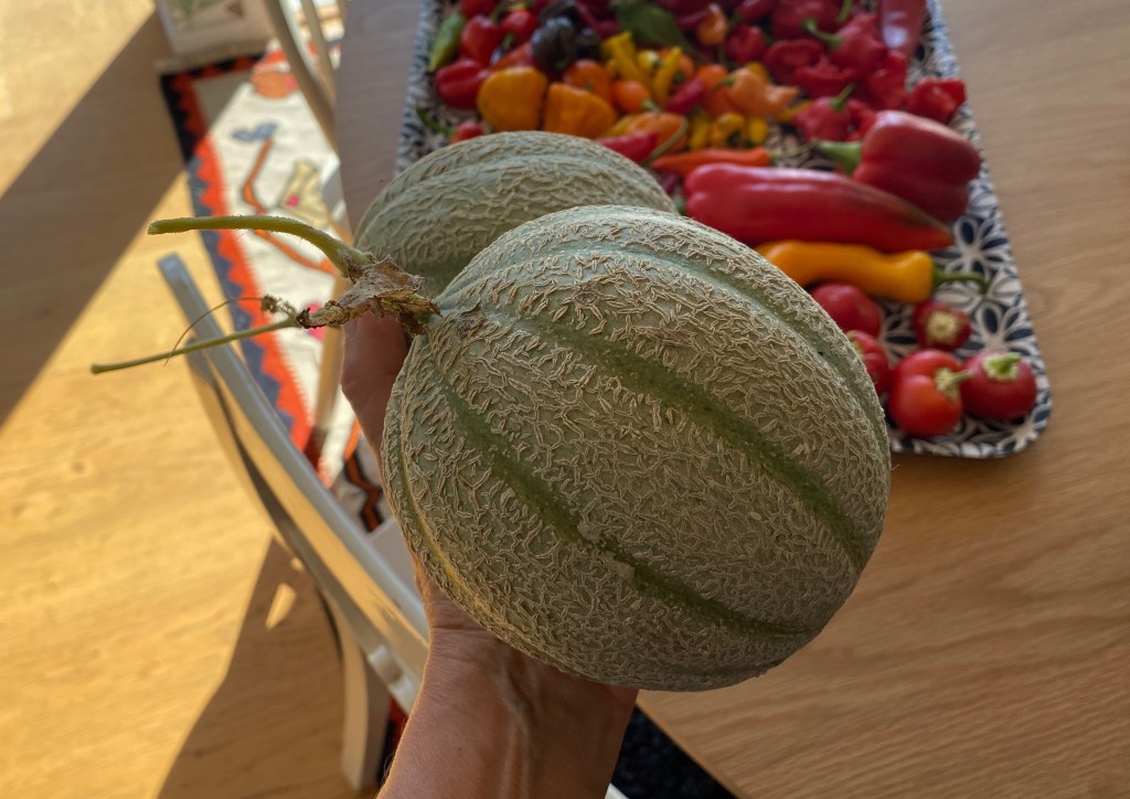 Just, mina nätmeloner… hur klarar de den här nattkylan! Bäst att skörda de två största. Blir spännande att se om de är mogna. Väntar med att dela dem tills Han är tillbaka från mötet med styrelsen och brygg–kommittén.