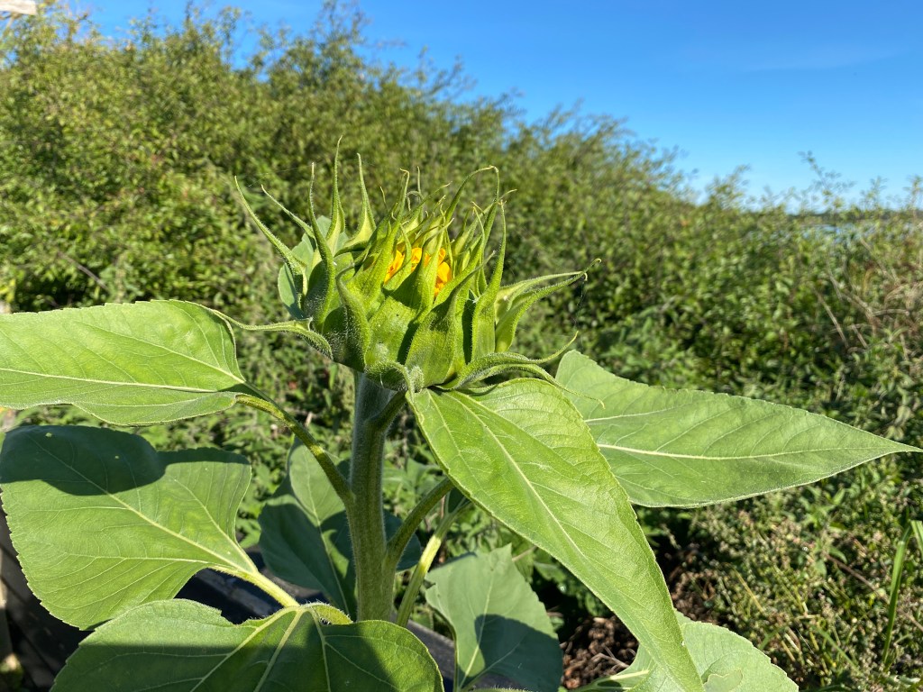Hon: sååååå fin morgon, helt bleke (missade ta bild, nu blåst upp lite…) och min fina sent satta solros, håller på att slå ut! Men det har varit kallt i natt, plus 5 grader som kallast enligt SMHI, tomaterna jag plockat av och lämnat ute på baksidan har typ frostskador. Det var uppe i +7 vid åtta, fortfarande kallt, men i solen på framsidan var det varmt och skönt.