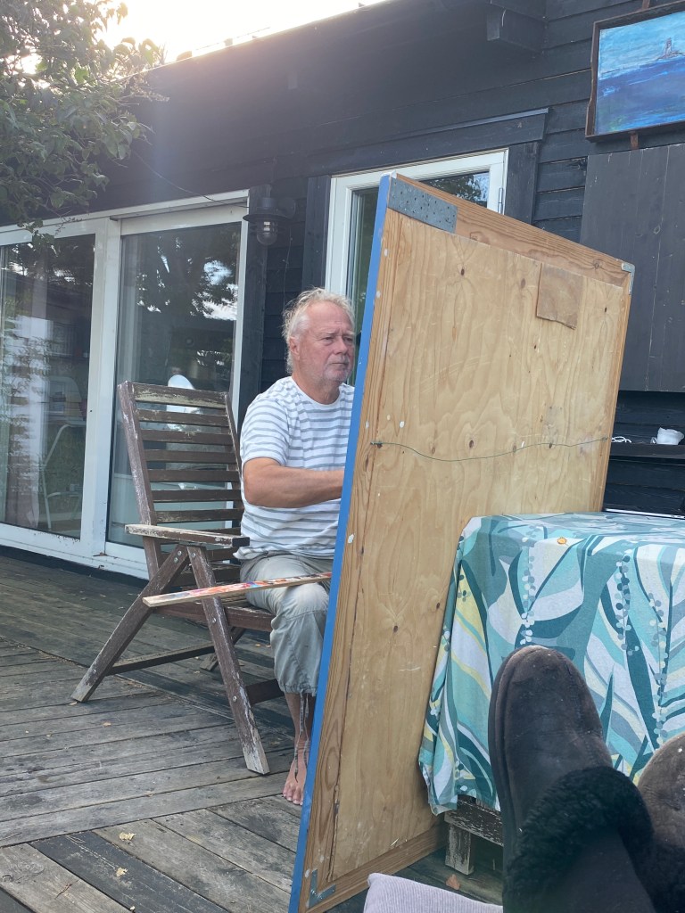 Hon: och nu målar han, går från klarhet till klarhet! Själv är jag trött idag, vet inte om det är det goda vinet till pizzan igår, eller den spontana trevliga drinken hos grannarna efteråt…