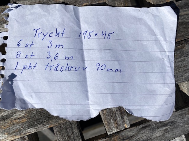Tro’t den som vill. Men för egen del är risken minimal att jag sätter upp omöjliga mål. Däremot ska jag åka till Lindbergs och köpa virke. Höjdhopparn och jag ska börja snygga upp vår gemensamma båtbrygga. Här är hans beställning: