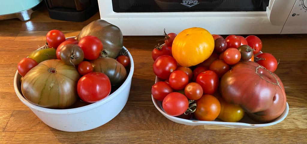 Hann iallafall ut och skörda de allra allra sista tomaterna innan mötet började. Blir säsongens sista Bolognese gjord på färska tomater till middag ikväll. Glad jag har frysen fullproppad med frysta.