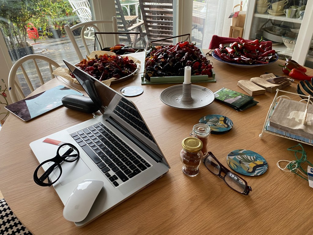 Hon: Hemma på udden igen, underbart, men hinner inte riktigt ta tag i kryddproduktion och annat fix med det som fortfarande ”lever” i växthus och pallkragar eftersom jag har en deadline att passa. Dessutom ett konferenssamtal vid ett idag. Blir lite extra stressad eftersom vi varit borta i drygt tre dygn och därför ligger efter med allt.
