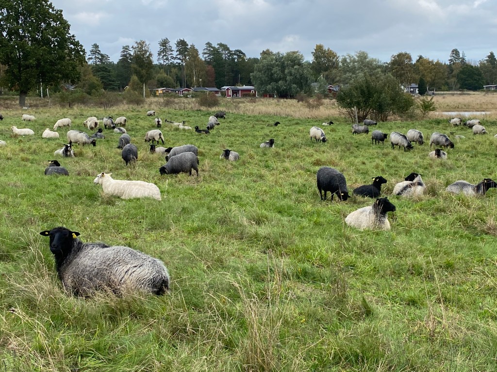Blev en hyfsat lång promenad efter lite förmiddags-jobb. Gick först bort till Järnsida, stugområdet på andra sidan vår lilla skog. Där var det helt plötsligt en massa får som betade längs strandängen. Kul! Stannade och pratade lite.