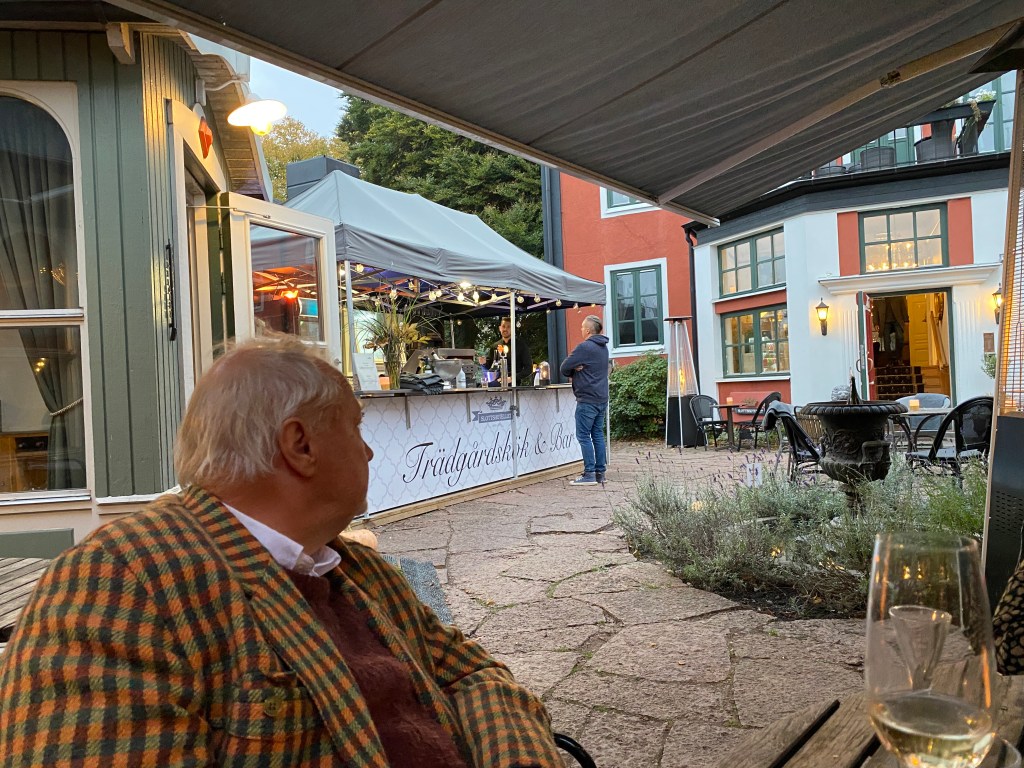 Kastade snabbt in väskorna på rummen, sen direkt ut till hotellets mysiga trädgårdsbar för ett glas bubbel innan avfärd mot slottet.