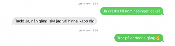 I klartext: Thomas är som alla duktiga murvlar en utpräglad tävlingsmänniska och mitt pris har skavt. Vilket belyses i följande sms-dialog oss emellan som du är den första att få ta del av: