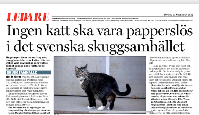 – Hårda tag alltså. Här ska inga jävla katter som inte bör vara här springa omkring i skugglandskapet och det är säkert bra att regeringen vill skapa ordning bland de papperslösa katterna.