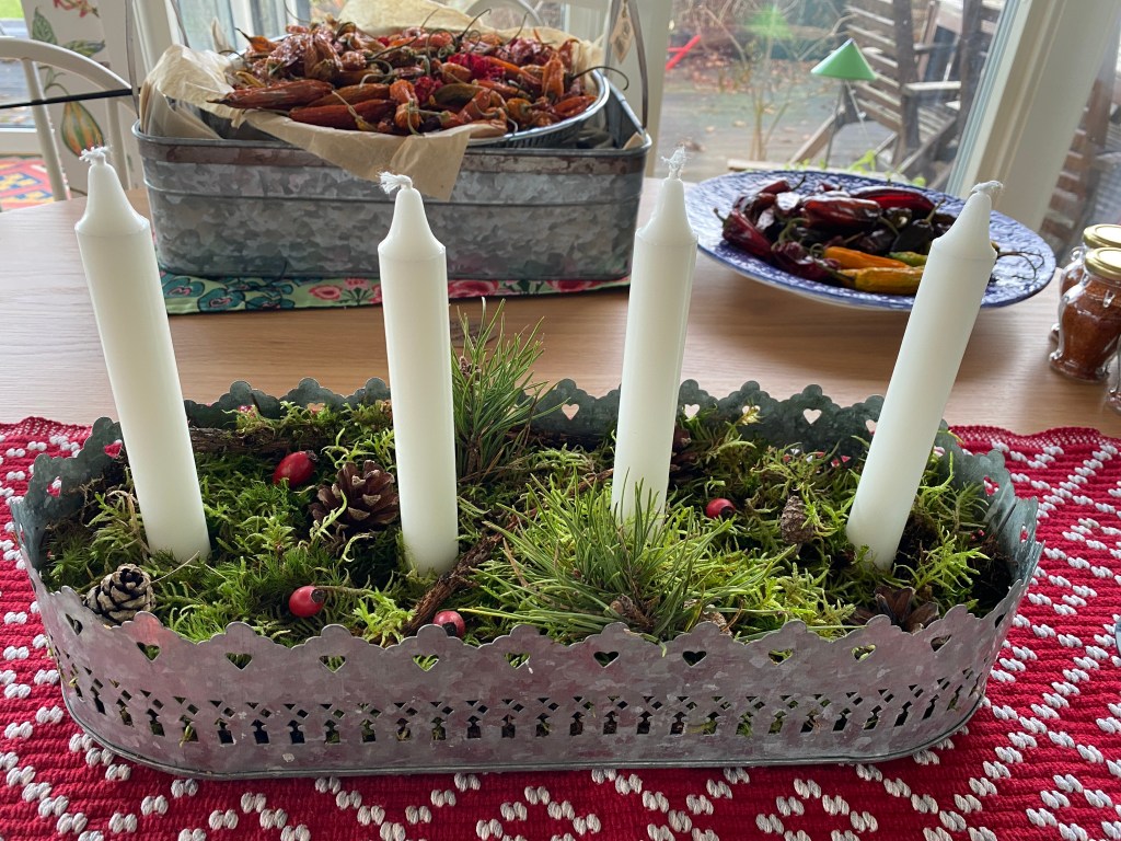 Och på tal om att kavla upp ärmarna så är det fullt ös framåt som gäller nu. På söndag är det första advent, och jag åker till Stockholm på torsdag och kommer hem först lördag kväll. Plockade mossa igår, satte en pepparkaksdeg i förrgår samt letade reda på adventsljusstaken idag. Och efter att ha satt de sista vitlökarna i jorden (det är nästan tjäle i marken nu…) arrangerade jag mossan i ljusstaken och tog fram julstjärnorna som han får sätta upp medan jag är borta. Imorgon blir det pepparkaksbak!