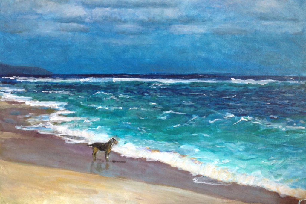 Och så visar han bilden på den hund som jag häromdagen betraktar när den betraktar havet och sedan försvinner innan jag hinner ta en bild, men som idag återuppstår på en kompis målning som målades innan jag betraktar den in real life vid ett annat hav långt från Alicante.