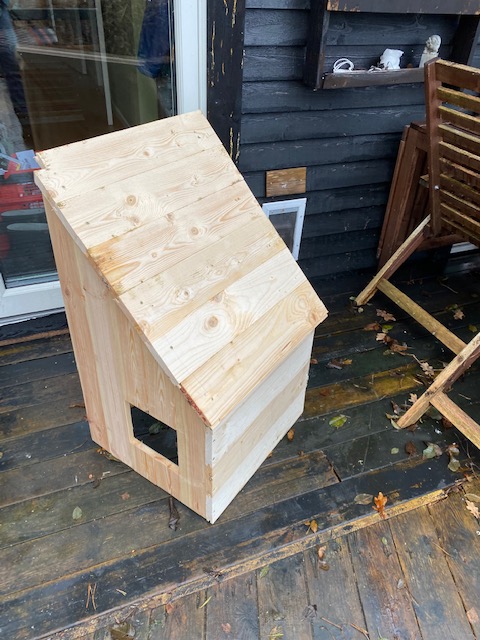 Saknas bara en takplåt och svart färg. Nyfikna Vilda har redan agerat testpanel. Även Ludde fattar. Patent är sökt.