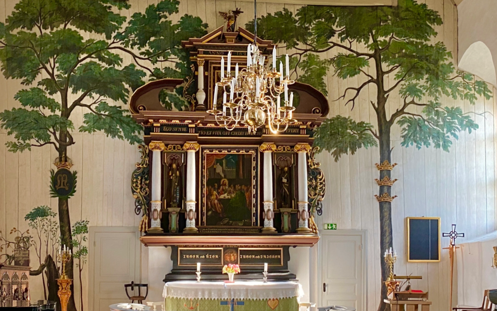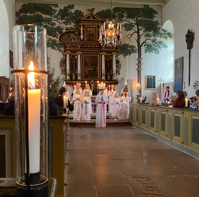 Att dagens Lucia och tärnorna representerades av idel blonda småflickor från trakten gjorde den kulturella kompotten komplett. Inte minst mot bakgrund av kyrkans vackra korvägg, målad av Johan Eneberg år 1838. På den enkla vitmålade väggen av ohyvlat breda bräder har Eneberg nämligen målat hennes älsklingsträd ­– långa smala svenska tallar som förenar jord och himmel.