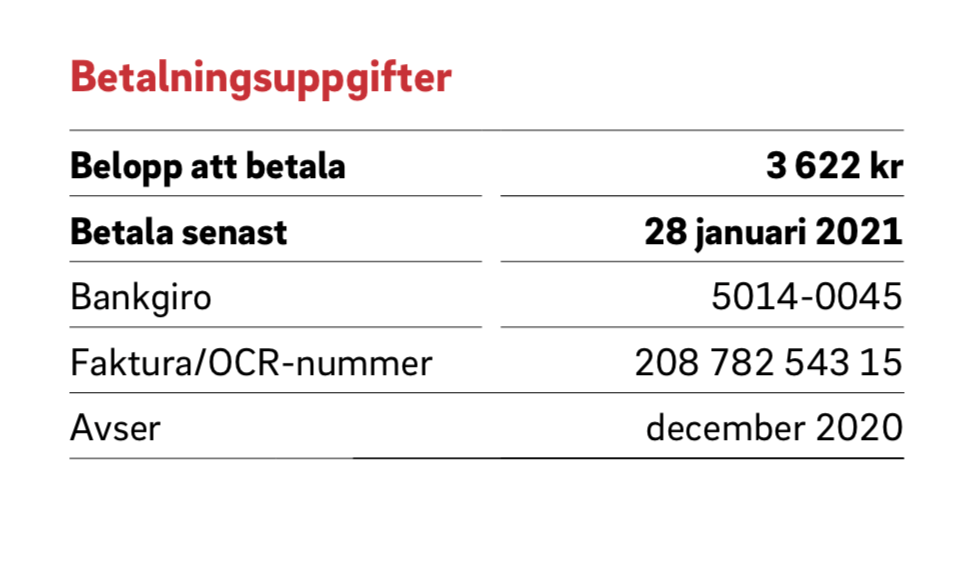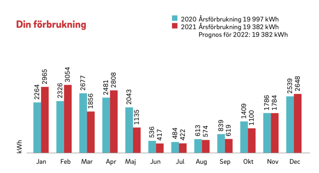 Det tyckte vi var mycket. Möjligen tyckte även ansvarig på E.O.N. det, för hen varnar oss: ”Om du förbrukar lika mycket i år som vid samma tid förra året (2 264 kWh), och med nuvarande pris skulle beloppet nästa gång bli cirka 3300 kr.”