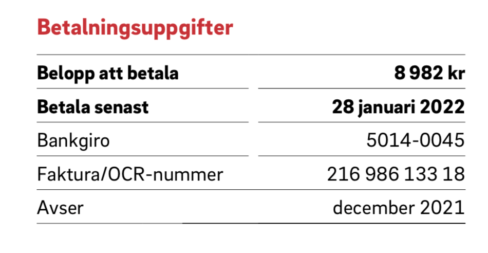 Ett år senare får vi E.O.N:s nota för december 2021: 8 982 kronor – för ganska exakt samma mängd kilowattimmar. Även denna gång påpekar den pedagogiske avsändaren på E.O.N: ”Om du förbrukar lika mycket i år som vid samma tid förra året (2 965 kWh), och med nuvarande pris skulle beloppet nästa gång bli cirka 10000 kr.”